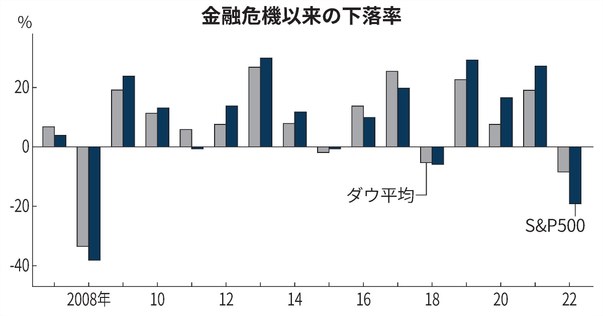 米国株は2008年の金融危機以来の下げ幅となった。S&P500指数は年間で19%下落した(日経電子版より引用)