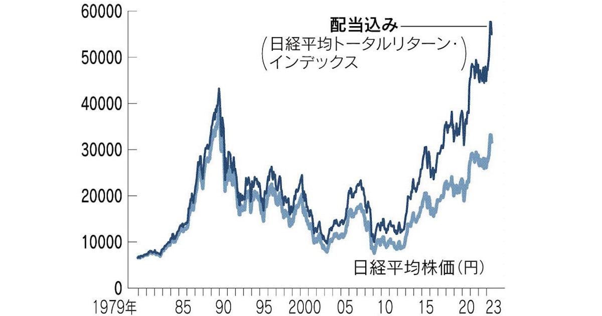 こんにちは、28日付日経朝刊で「日本株、複利効果の光明」と題した記事が掲載されました。記事によると、配当金再投資を考慮した日経平均トータルリターン・インデックスは1979年末時点を6,569として算出していますが、今年8月25日時点で5万4,956です。2020年11月にはバブル期の最高値4万3,200を抜いていました。日経平均株価が現時点でも最高値を更新できていないのと対照的です。配当再投資による複利効果の影響が見て取れます。記事では高配当株や減配をせずに増配方針を示している個別株を紹介していますが、実は配当再投資による複利効果を合理的かつ効率的に実現する方法があります。積み立て型少額投資非課税制度(つみたてNISA)対象で、分配金を出さずにファンド内で再投資している低コストかつ時価総額加重平均型の全世界、全米、S&P500、先進国株式インデックスファンドに投資することです。