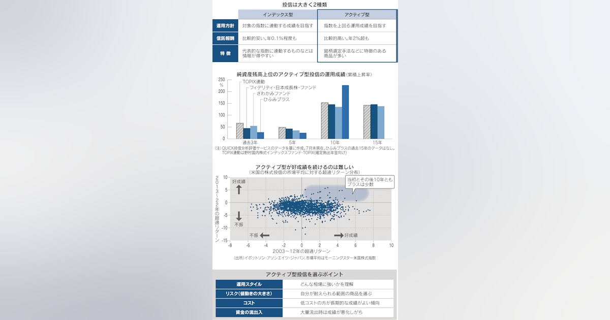こんにちは、2日付日経朝刊マネーのまなびで「アクティブ投信 実力を知る」と題した記事が掲載されました。2024年からの新少額投資非課税制度(新NISA)の投資対象の大半を占めるアクティブファンドの実態と注意点を記しています。市場平均を上回る商品は極めて少なく、仮に市場平均を上回る年があったとしても、好成績が続くケースは一層少なくなる点などが様々なデータを基に紹介されています。「成長投資枠戦略」と称して新NISAの成長投資枠で手数料の取れるアクティブファンドを売り込みを画策する金融機関や金融機関に紐づいたファイナンシャルプランナー(FP)、金融インフルエンサーに対する「処方箋(せん)」になりうる記事だと思います。