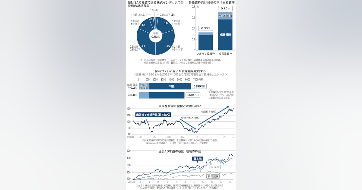 詳しい記事の内容は該当日付の日経朝刊または日経電子版でご覧ください。田村氏によると、株式インデックス型の信託報酬は新NISA全体で平均年0.44%、総経費率は1.2倍の年0.53%と述べています。総経費率が信託報酬の2~3倍に達するケースもあるといいます。総経費率にばらつきがあり、年0.2%以下、0.8%超ともにそれぞれ2割を占めます。つみたて枠(成長投資枠でも投資可能)のインデックス型の総経費率平均が年0.33%に対し、成長投資枠限定のインデックス型の総経費率は年0.70%と2倍強となっっています。コスト控除前の成績が全世界株価指数と同じ全世界株式投資信託に1990年1月から月3万円を積み立て投資をした場合、総経費率年0.2%ならば、2023年1月時点で6,396万円にまで増加していると明かします。一方、総経費率年0.8%で計算すると5,601万円で約800万円少なくなってしまうとしています。区切る区間によって、米国株式が有利だったり、全世界株式が有利だったりと時期によって違うと語っています。なお、アベノミクス相場が始まる2012年10月末以降で比較すると、日本株式の上昇率は実は米国株式をも上回っています。時価総額加重平均型の全世界株式インデックス型を基本にすると、国・地域や通貨分散を図れるとしています。低コストインデックス型の品ぞろえはネット証券の優位性が際立つと付け加えています。