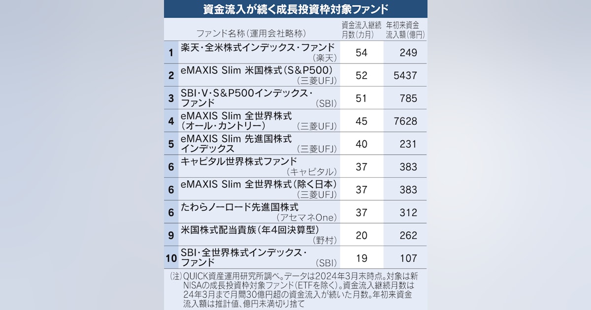 資金流入が長く続いているのは、どんな投資信託か。新しいNISA(少額投資非課税制度)の成長投資枠対象ファンド(上場投資信託=ETF=を除く)を対象に、月間30億円超の資金流入が継続している月数でランキングしてみた。首位は「楽天・全米株式イン...