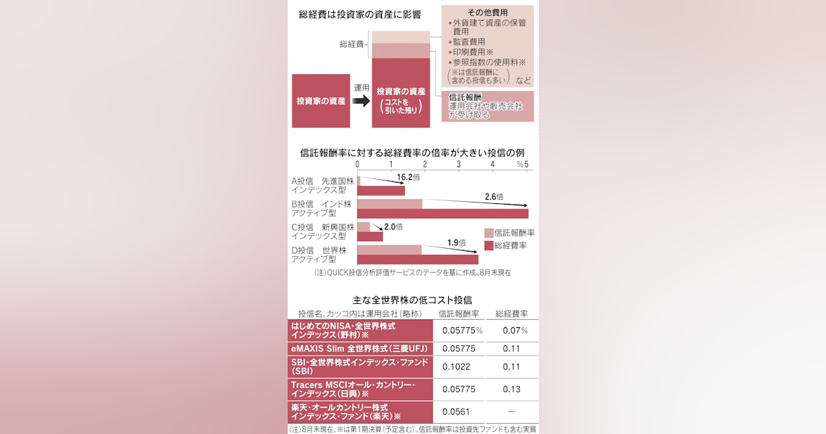 詳しい記事の内容は該当日付の朝刊を読むか、日経電子版(有料会員限定記事)をご覧ください。楽天証券に口座を開設して取引アプリ「iSPEED」をダウンロードすれば「楽天テレコン」からも一定期間読むことができます。記事では、純資産総額の小さいNISAつみたて投資枠対象の先進国株式インデックスファンドの総経費率が信託報酬の16倍超の年1.4%だった例などを紹介しています。元の信託報酬は低コストなのに、実質コストが高コストではあまりにももったいないです。なお、低コストかつ時価総額加重平均型の全世界株式インデックスファンドの実質コストを8月末時点での最新決算時点で比較しており、はじめてのNISA・全世界株式インデックス(はじカン)が年0.07%だったと紹介しています。eMAXIS Slim 全世界株式(オルカン)は年0.11%でした。田村氏はオルカンの純資産の急拡大で海外資産の新規取得分の保管費用が一時的にかさんだ面もあると理由を明かしています。さらに、オルカンの決算時点で出た実質コストは信託報酬が年0.1133%や年0.1144%時代の時期も相当期間含んでいるので、その点は考慮する必要がありそうです。