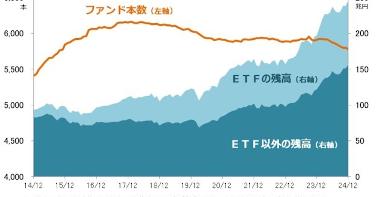 詳しい記事の内容は上のリンクからご覧ください。報道によると、ETFを除く非上場投資信託の純資産総額が前月比5兆366億円増の156兆6,377億円となり、3カ月連続で過去最高を更新しました。追加型株式投資信託に推計8,000億円超の資金が流入し、残高増加につながったと報じています。ETFの残高は89兆3,738億円で、2024年6月に記録した過去最高の89兆6,118億円には届きませんでした。国内公募投資信託の2024年12月末時点の本数は、前月比24本減の5,776本でした。前年比では137本減り、年末ベースで2014年末以来10年ぶりの少なさとなりました。通貨選択型などを中心に運用会社が小規模で運用成績が低迷しているファンドの整理を進めており、償還本数が新規設定分を上回ったことが背景にあるといいます。通貨選択型投資信託は毎月分配型などに多く見られる闇が深いボッタクリ投資信託がほとんどです。こうした投資信託が駆逐されるのは、ある意味当然だと思います。それにしても、投資信託の本数5,700は多すぎます。残念ながら少なく見積もって9割以上は検討する価値すらない高コスト投資信託です。