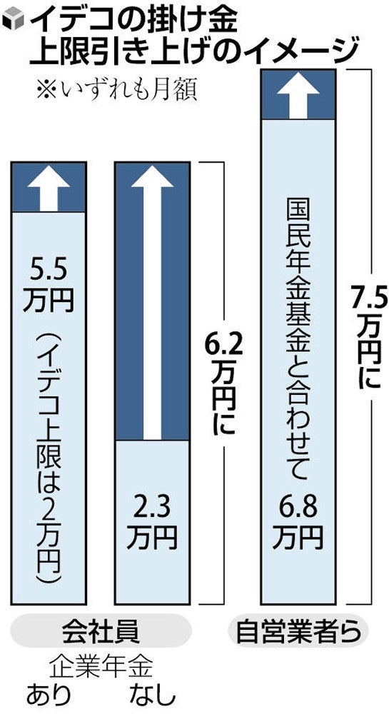 詳しい記事の内容は上のリンクからご覧ください。読売新聞の報道によると、政府・与党は年金改革関連法案提出の目安である14日までに提出できなかったといいます。iDeCoの掛け金引き上げ案では、第1号被保険者(自営業や個人事業主)が月6万8,000円から7,000円上昇し、月7万5,000円に引き上げられます。第2号被保険者はiDeCo単体の上限2万円(企業年金あり)または上限2万3,000円(企業年金なし)が撤廃されます。企業年金なしの場合は月2万3,000円から月6万2,000円に大幅上昇します。企業年金ありの場合は「月5万5,000円-(企業型確定拠出年金<DC>月額+確定給付企業年金<DB>月額)」(最大月2万円)から、「月6万2,000円-(DC月額+DB月額)」に増えます。iDeCoに掛け金を拠出する期間も65歳未満から70歳未満に引き上げとなります。なお、専業主婦は月2万3,000円のまま変更はありません。
