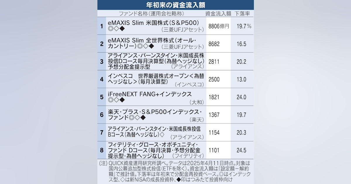 こんにちは、年初から4月11日までの資金流入額ランキングで、首位はeMAXIS Slim 米国株式(スリムS&P500)で8,806億円の資金が流入しました。2位はeMAXIS Slim 全世界株式(オルカン)で、流入額が8,682億円でした。ほぼ互角といえるレベルで拮抗し、3位以下を大きく引き離しています。23日付日経電子版が報じました。足元ではスリムS&P500が年初来からマイナス15%強、オルカンがマイナス10%強と下落が続いていますが、少額投資非課税制度(NISA)を通じて安定して資金流入が続いているといえそうです。