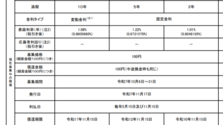 株式投資の心構え 個人向け国債変動10年、金利年1.08% 6日から31日まで募集される2025年11月17日発行の個人向け国債変動10年(変動10)の金利が年1.08%(税引後年0.8605980%)に設定され、前回発行比で年0.02ポイント上がりました。算定基準となる10年国債金利(長期金利)が... 2025.10.06 株式投資の心構え株式長期投資